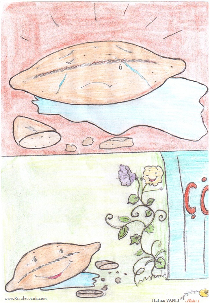 Resimdeki ağlayan ekmeğin adı NİMET. Nimet o kadar ağlamış ki, dökülen boncuk boncuk gözyaşları yerde gölcük oluşturmuş.